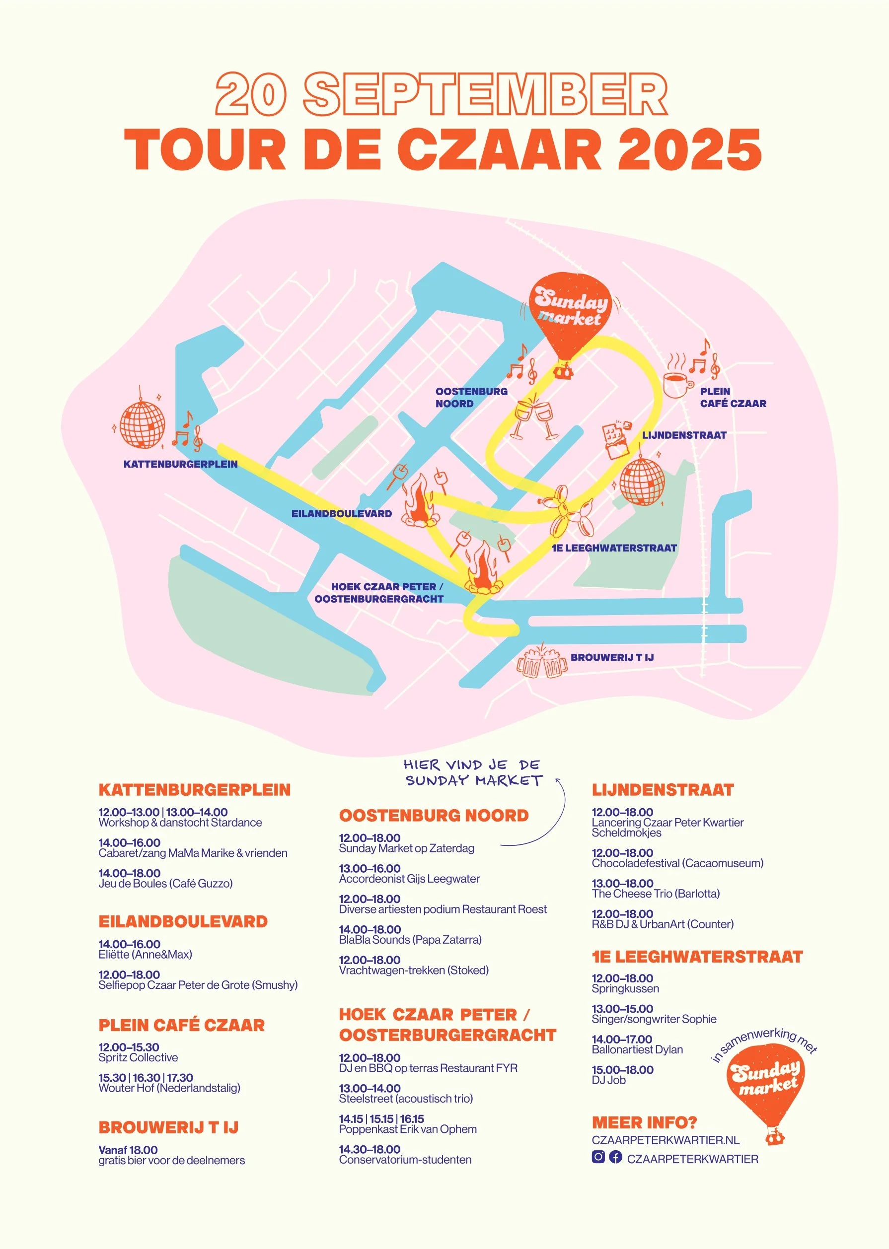 Verspreid over locaties zoals het Kattenburgerplein, de Lijndenstraat, Brouwerij ’t IJ en natuurlijk Café Czaar zelf, staat er de hele dag een bomvol programma klaar. Slenter langs de Sunday Market, geniet van culinaire specials of laat je verrassen door lokaal talent en optredens.